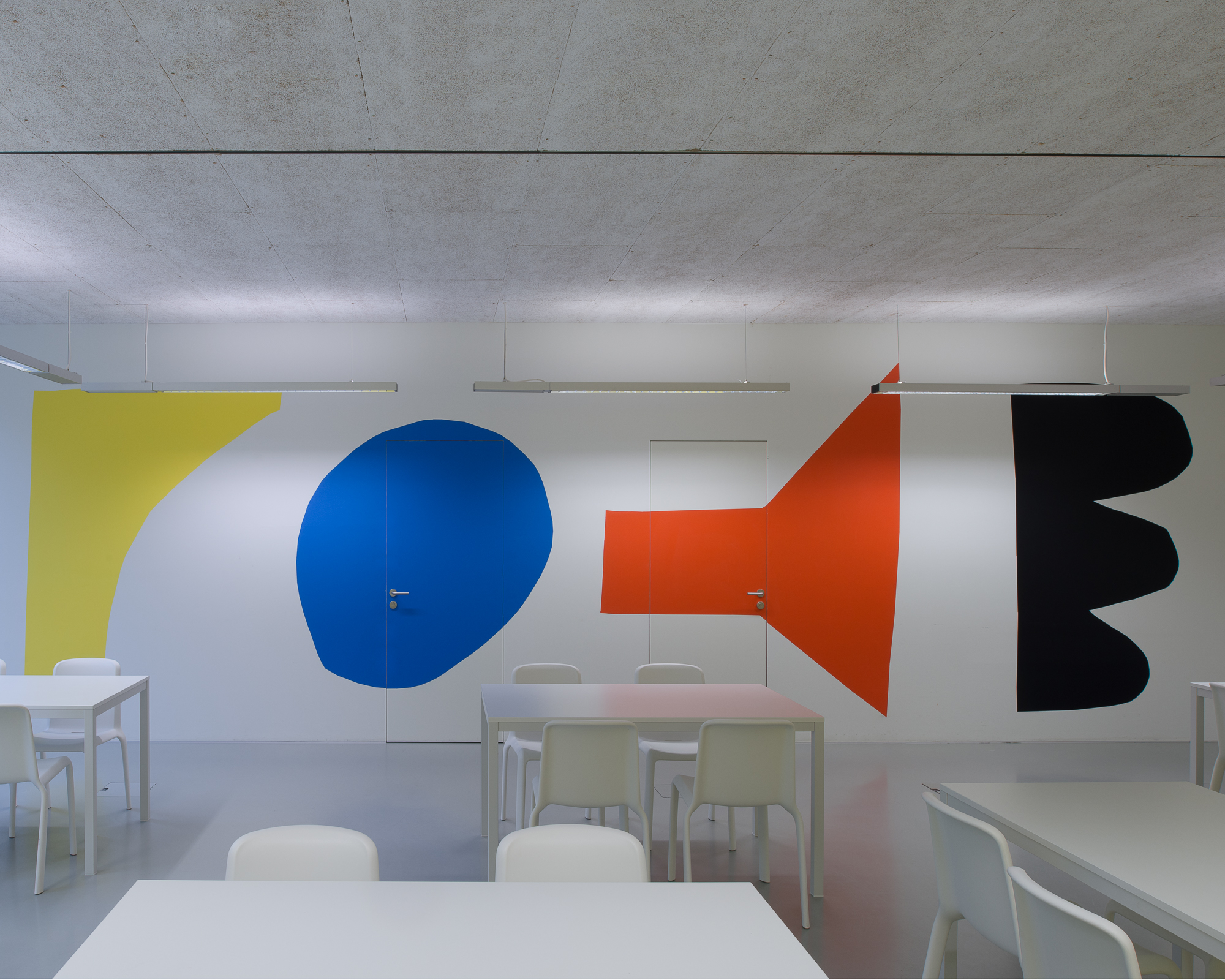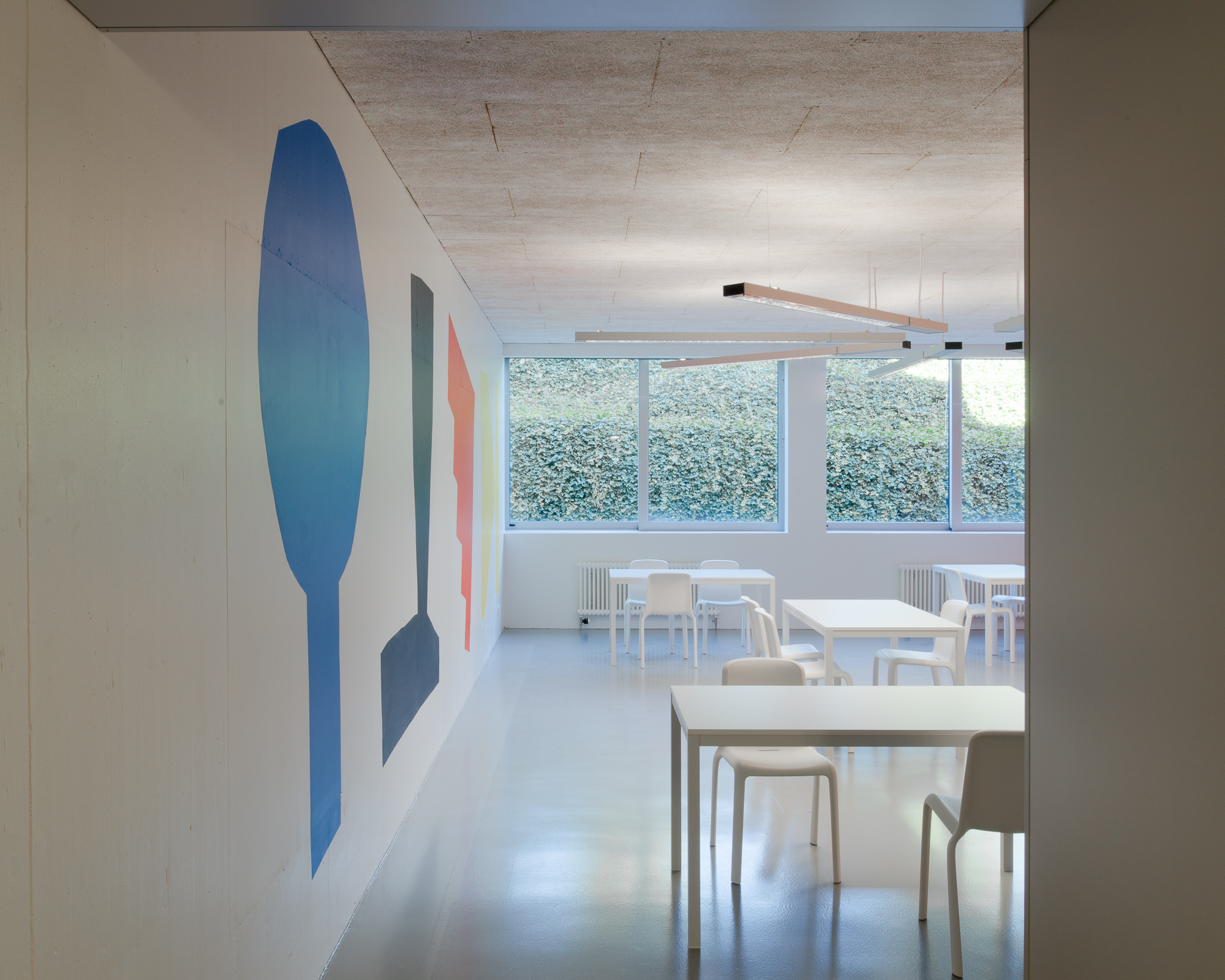 Les locaux ont donc été repensés pour correspondre à leur nouvelle fonction, notamment par la création d'espaces de vestiaire et la division de la surface en différents sous-espaces. Outre un bureau de direction, une salle du personnel et une cuisine professionnelle, le reste des locaux est entièrement à disposition des enfants, qui peuvent se répartir entre petites salles de travail et grandes salles de vie.