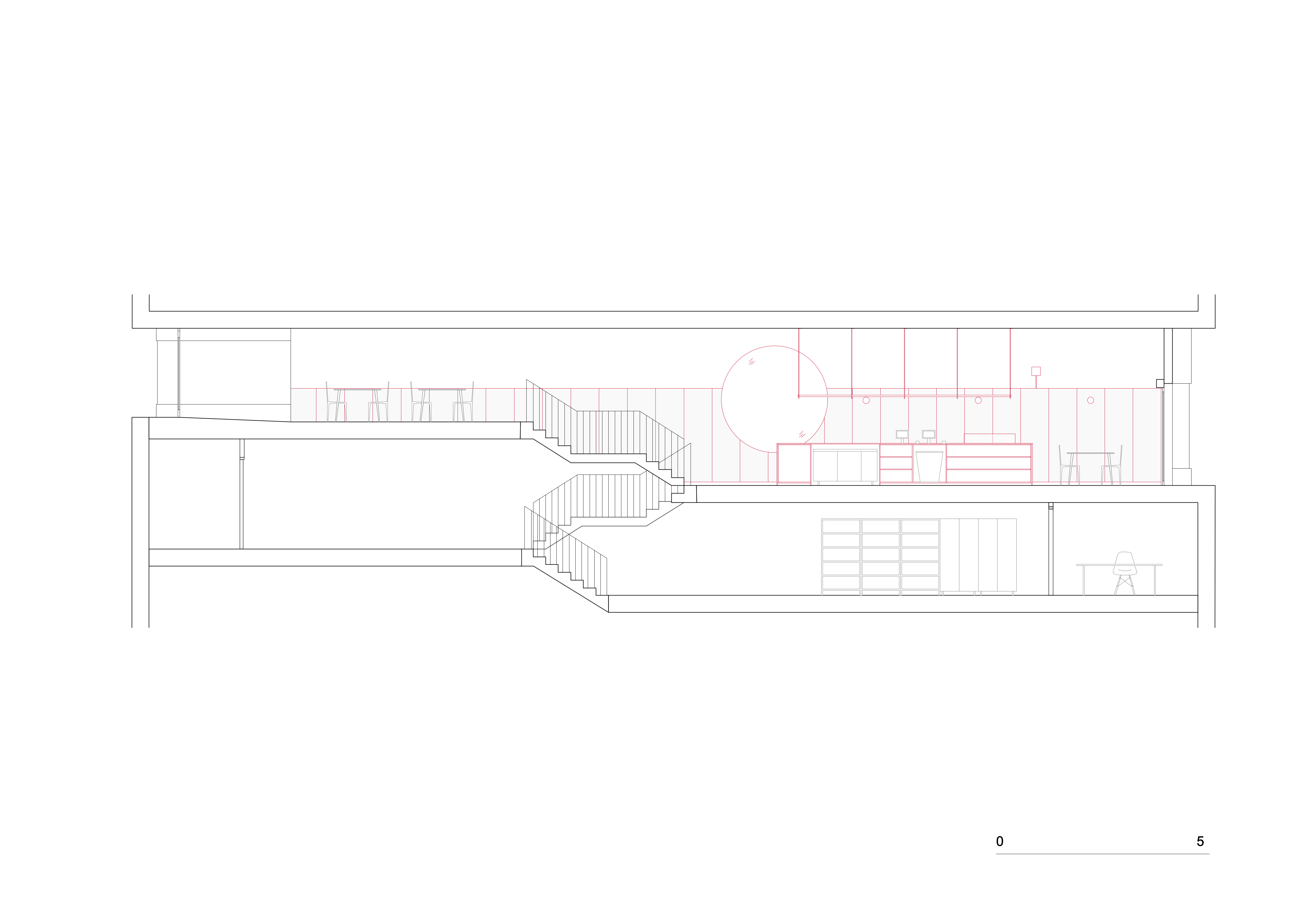 Le rez-de-chaussée s’organise autour d’un îlot en inox brossé accueillant le bar et les guichets de commandes. Différentes zones d’assise se déploient ensuite le long de l’espace. Les matériaux, choisis pour leur neutralité et leur authenticité, combinent tôle ondulée galvanisée et habillages muraux en noyer apportant ainsi chaleur et contraste.