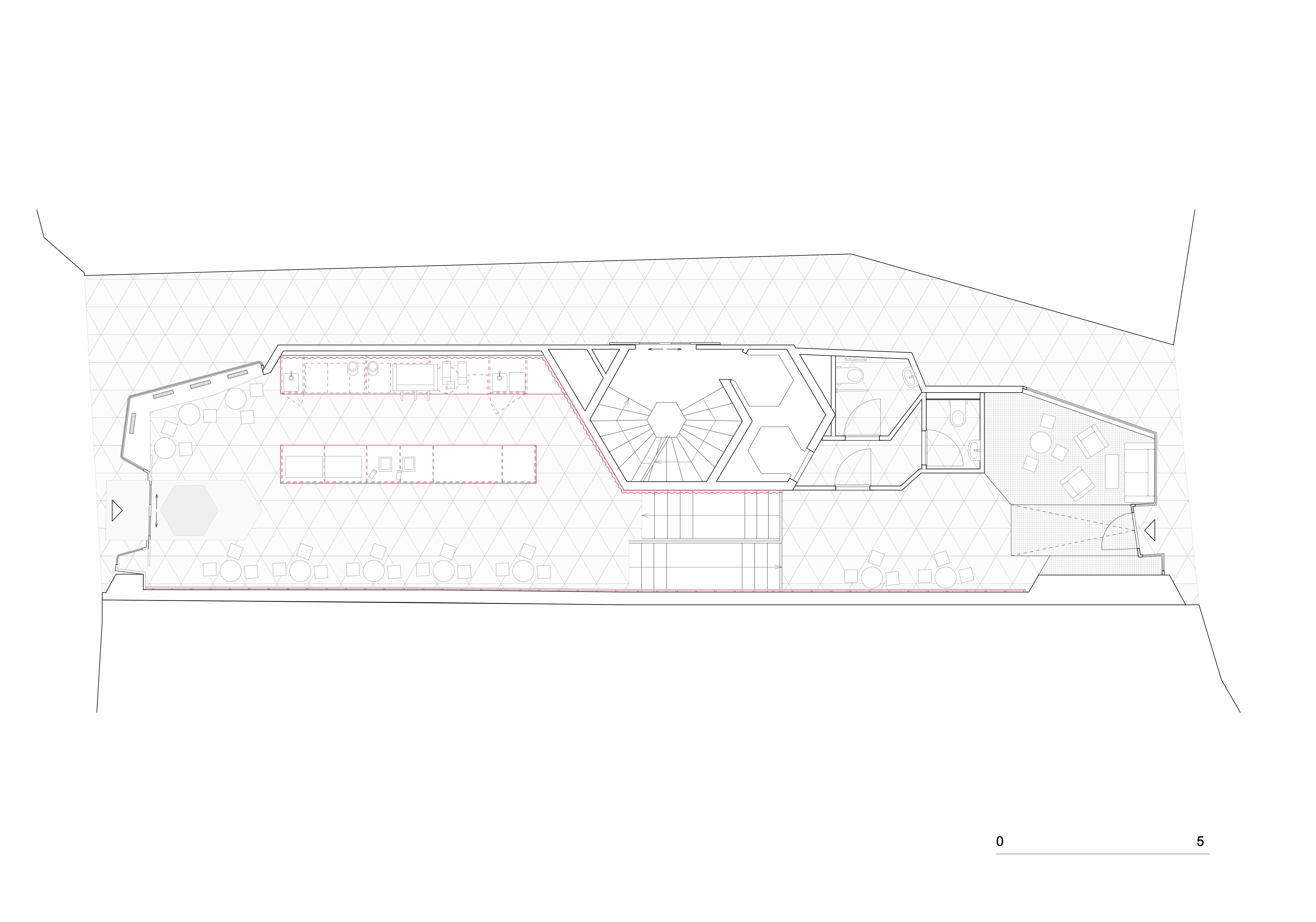 Un luminaire suspendu de six mètres, conçu par l’artiste Simon Depierraz, souligne l’îlot et structure l’ensemble, offrant au café une atmosphère contemporaine et soignée.