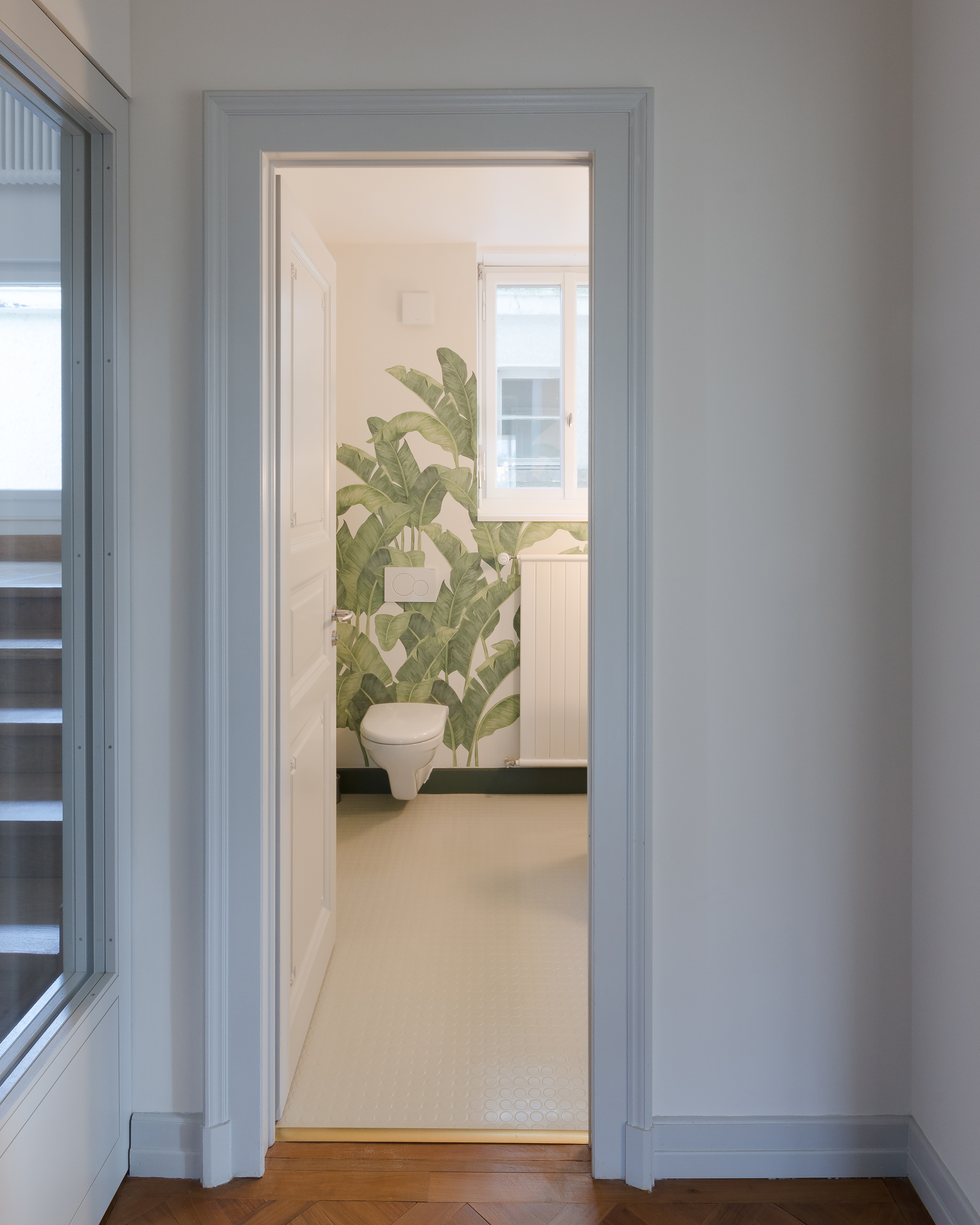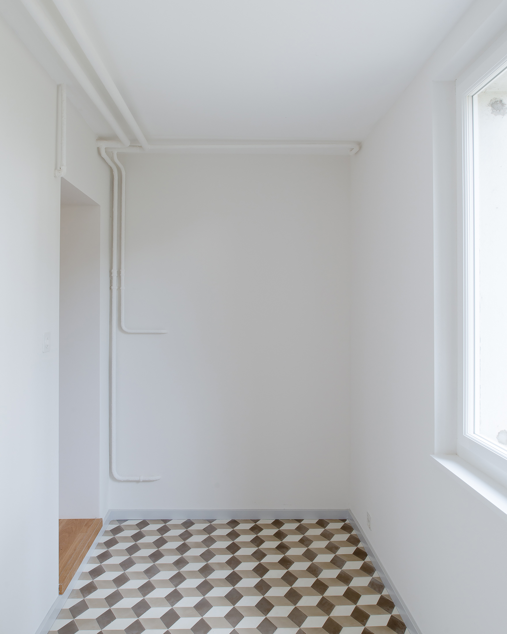 Dans le cadre de son rachat, l’intervention architecturale accompagne la partition de l’objet en lots distincts souhaitée par le jeune couple. Au niveau inférieur sur le jardin, l’appartement indépendant de deux pièces est repensé sans ses cloisons qui révèle un jeu de niveau caractérisant chaque espace. Dans les combles, les pièces sont redistribuées pour accueillir un appartement semi-indépendant destiné à accueillir une colocation d’étudiants autour de l’ajout d’une cuisine. Aux étages nobles sur rue et au premier étage, l’appartement de la famille s’installe. Outre la réfection de toutes les surfaces quelques articulations clefs sont repensées. Au premier étage, la salle de bains parentale est retravaillée tandis qu’au rez de chaussée une bande de service sur la façade nord permet de repenser les interfaces avec l’extérieur par l’ajout d’un vestibule tout en clarifiant la relation entretenue par la cuisine et la salle à manger.